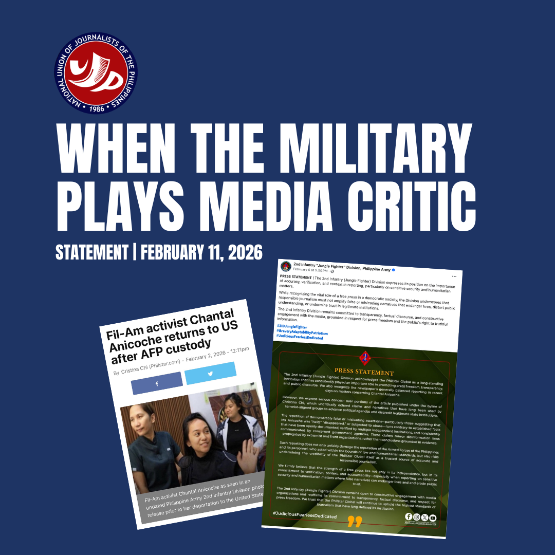 The National Union of Journalists of the Philippines notes with concern a press statement by the 2nd Infantry Division of the Philippine Army essentially calling out Philstar.com journalist Cristina Chi for “the repetition of demonstrably false or misleading assertions” that it said “mirror disinformation lines propagated by extremist and front organizations.”